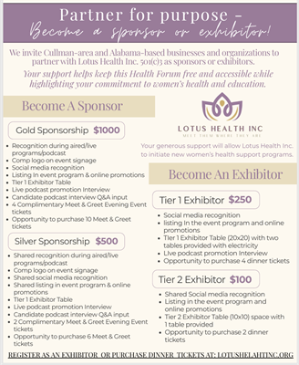 For information on becoming a speaker, vendor, or sponsor, please visit http://lotushealthinc.org/events/women's-health-forum