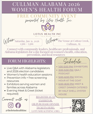 The Cullman Alabama 2026 Women’s Health Forum is a free, community-driven event hosted by Lotus Health Inc., dedicated to empowering women through education, prevention, and access to vital health resources. This impactful gathering will bring together healthcare professionals, community leaders, legislators, and exhibitors from across the state to address critical issues in women’s health, rural healthcare access, and maternal outcomes.