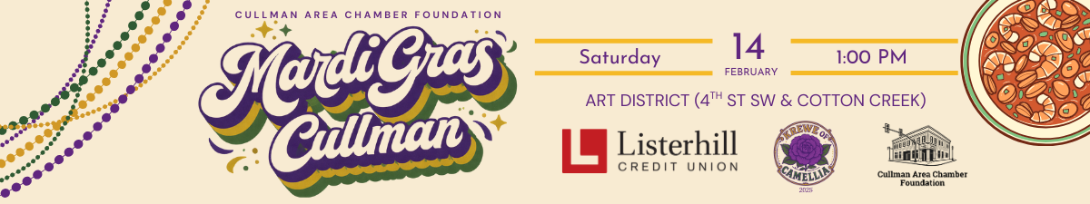 Join the Cullman Area Chamber Foundation for a lively celebration filled with music, flavor, and community spirit at our inaugural Mardi Gras Parade & Gumbo Cook-Off, happening in the Art District (Cotton Creek area) on Saturday, February 14th.