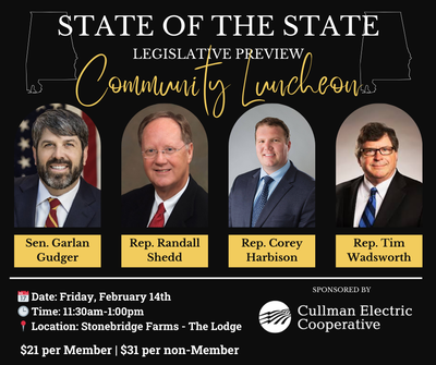 Join us for an insightful afternoon at the State of the State: Legislative Preview Community Luncheon. Thank you to our sponsor, Cullman Electric Cooperative and our Registration Sponsor, Cullman Regional Medical Center.